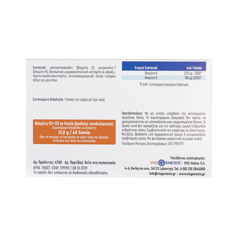 VioGenesis Vitamin K2 (MK-7) 225 μg & Vitamin D3 4000 IU Depot Βραδείας Αποδέσμευσης, 60 tabs