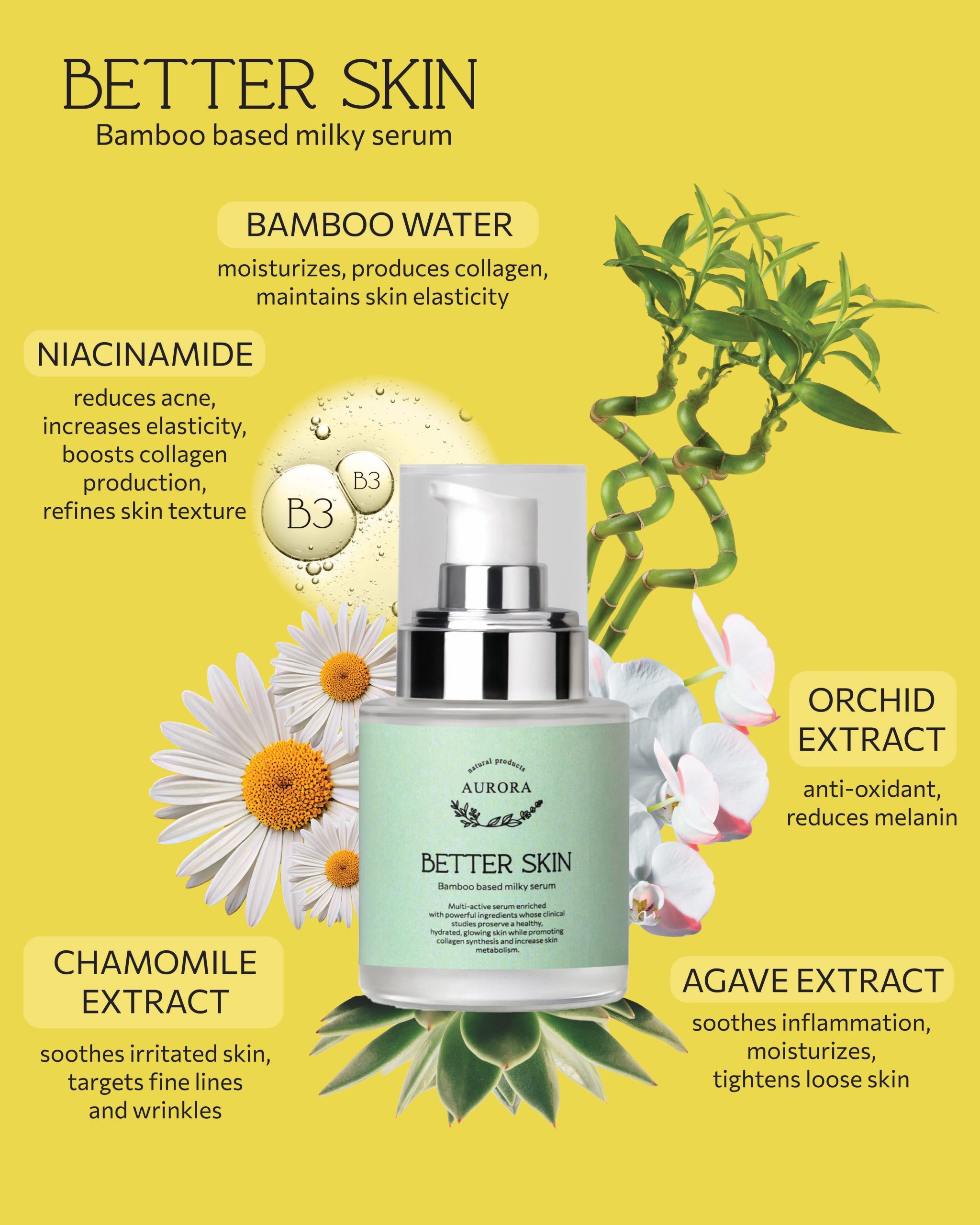 Ορός προσώπου εμπλουτισμένος με νιασιναμίδη, πεπτίδια, υαλουρονικό οξύ, καθώς και εκχυλίσματα από νερό bamboo, ορχιδέα, χαμομήλι, αγαύη και εκτοΐνη. Συστατικά τα οποία συμβάλλουν στην ολιστική αναδόμηση και ενυδάτωση της επιδερμίδας, μέσω της διέγερσης των ινοβλαστών και της παραγωγής κολλαγόνου, έχοντας ισχυρές αντιρυτιδικές ιδιότητες και βελτιώνοντας τη συνολική υφή και την απαλότητα του δέρματος.