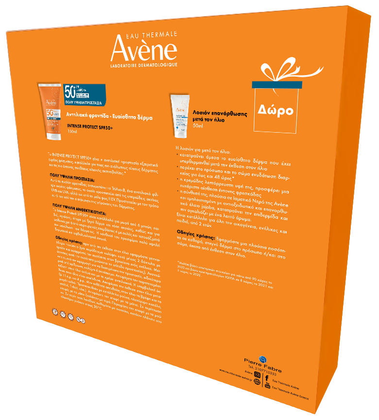 • Avene Intense Protect SPF50+, 150ml.   Το Intense Protect 50+ αποτελεί προϊόν αντηλιακής φροντίδας εξαιρετικά ευρέος φάσματος. Για πρώτη φορά, η φωτοπροστασία διευρύνεται πέρα από τις UVB-UVA σε ένα επικίνδυνο μέρος της ηλιακής ακτινοβολίας : το ορατό, μπλε φως υψηλής ενέργειας. Αντηλιακή φροντίδα προσαρμοσμένη στις πιο έντονες συνθήκες ηλιοφάνειας, καθώς και στο πιο ευάλωτο δέρμα*. Η υβριδική υφή του επιτρέπει την απορρόφησή του από το δέρμα σε 3 δευτερόλεπτα**, παρέχει έντονη ενυδάτωση για 8 ώρες*** και δράση κατά της ξηρότητας. Η nude απόχρωσή του προσφέρει ένα διαφανές, αόρατο τελείωμα χωρίς λευκά ίχνη, ακόμη και στους πιο σκούρους τόνους δέρματος. Είναι εξαιρετικά ανθεκτικό στο νερό και ανθεκτικό στον ιδρώτα. Το Intense Protect 50+ είναι κατάλληλο για βρέφη από έξι μηνών, παιδιά, εγκύους και ασθενείς μετά από χειρουργείο, καθώς και για το επουλωμένο δέρμα με τατουάζ. Η σύνθεσή του προσφέρει πολύ υψηλή δερματική και οφθαλμολογική ανοχή. Με μόνο τέσσερα φίλτρα, συγκέντρωση μειωμένων αντηλιακών φίλτρων**** και χωρίς σιλικόνη, η σύνθεσή του είναι φιλική προς το περιβάλλον. Η βιοδιασπασιμότητα***** της σύνθεσης είναι βέλτιστη. Τα μη-οικοτοξικά ηλιακά φίλτρα δεν έχουν κανένα αντίκτυπο στα κοράλλια, το φυτοπλαγκτόν και το ζωοπλαγκτόν. Συνεπώς, σέβεται τη θαλάσσια βιοποικιλότητα******.