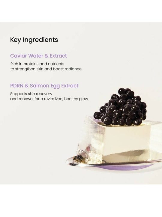 Caviar Water, Water, Glycerin, Dipropylene Glycol, Cetyl Ethylhexanoate, 1,2-Hexanediol, Niacinamide, Propylene Glycol Dibenzoate, Chondrus Crispus Extract, Ceratonia Siliqua (Carob) Gum, Butyrospermum Parkii (Shea) Butter, Hydroxyacetophenone, Polyglyceryl-3 Methylglucose Distearate, Potassium Chloride, Algin, Chondrus Crispus Powder, Polyacrylate-13, Allantoin, Glyceryl Stearate, Cellulose Gum, Glucomannan, Xanthan Gum, Ethylhexyl Olivate, Eclipta Prostrata Extract, Sucrose, Ethylhexylglycerin, Hydrogenated Polyisobutene, Sodium Acrylates Copolymer, Sodium Polyacryloyldimethyl Taurate, Adenosine, Melia Azadirachta Leaf Extract, Sodium Phytate, Polyglyceryl-4 Oleate, Polyglyceryl-10 Laurate, Ethylhexyl Palmitate, Melia Azadirachta Flower Extract, Pyrus Communis (Pear) Fruit Extract, Sorbitan Isostearate, Rosa Damascena Flower Water, Sodium Polyacrylate, Coccinia Indica Fruit Extract, Caviar Extract, Salmon Egg Extract, Iris Florentina Root Extract, Cucumis Melo (Melon) Fruit Extract, Moringa Oleifera Seed Oil, Hedera Helix (Ivy) Leaf/Stem Extract, Solanum Melongena (Eggplant) Fruit Extract, Aloe Barbadensis Flower Extract, Simmondsia Chinensis (Jojoba) Seed Oil, Ocimum Sanctum Leaf Extract, Curcuma Longa (Turmeric) Root Extract, Corallina Officinalis Extract, Tocopherol, Sodium DNA