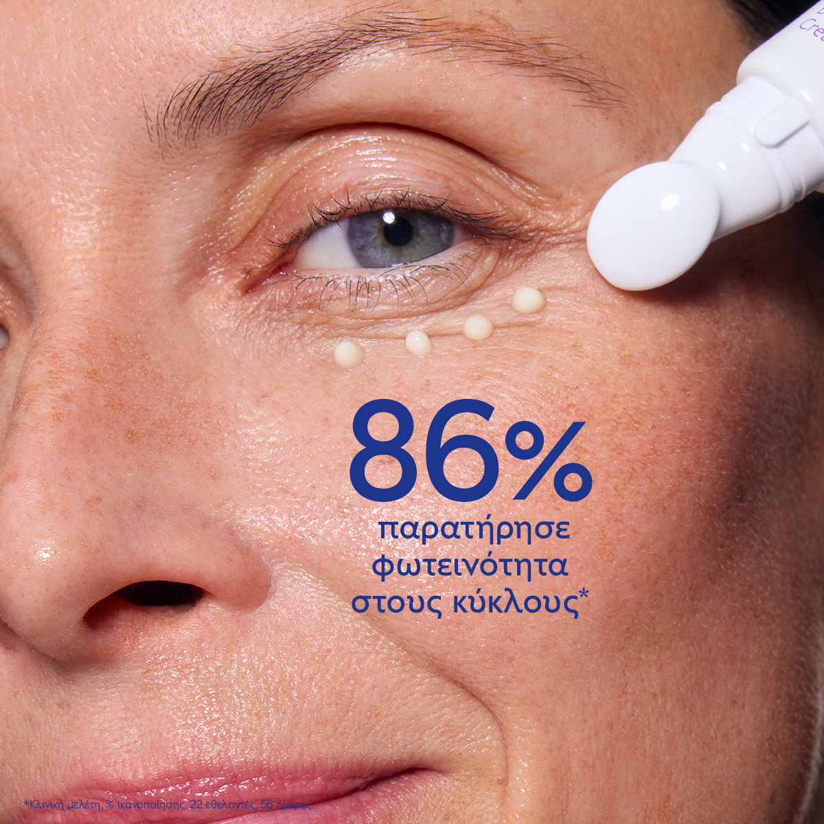 Για φρέσκο και ξεκούραστο βλέμμα, χρησιμοποιήστε το στόμιο ως πινέλο: τοποθετήστε την κρέμα κάτω από το περίγραμμα των ματιών και κάντε απαλό μασάζ από μέσα προς τα έξω και στη συνέχεια σε όλο το περίγραμμα των ματιών με το στόμιο μέχρι να απορροφηθεί πλήρως το προϊόν.