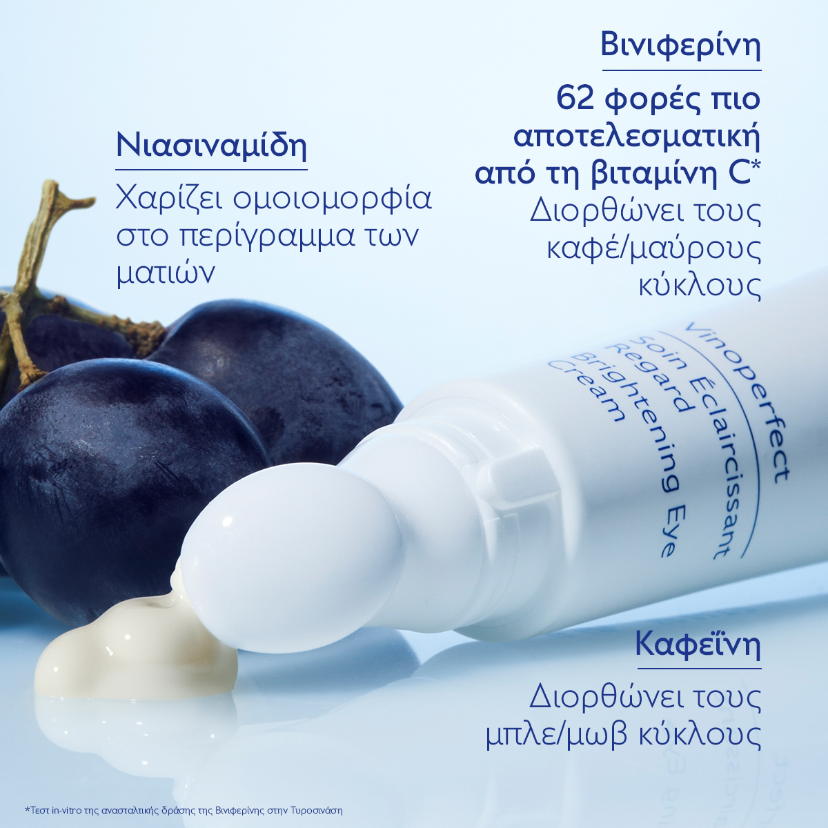 Η Brightening Eye Cream Vinoperfect διορθώνει όλους τους τύπους κύκλων, είτε είναι αγγειακοί (μπλε ή μωβ κύκλοι) είτε μελαγχρωματικοί (καφέ ή μαύροι κύκλοι).
