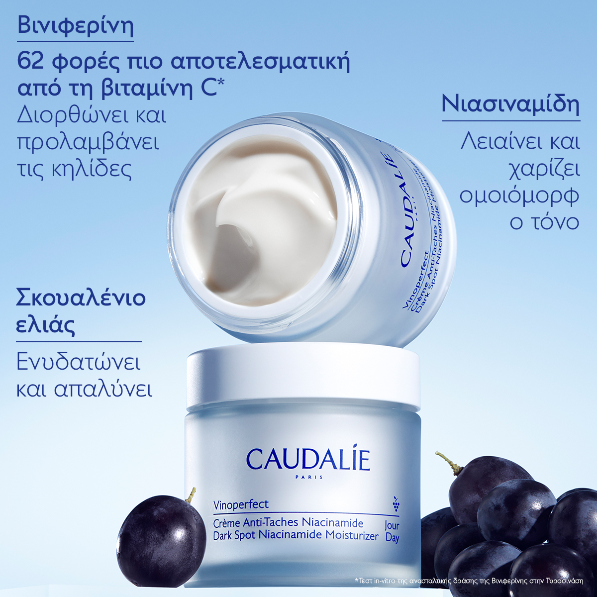 Εμπνευσμένη από τον ορό Vinoperfect, το N°1 προϊόν κατά των κηλίδων στη Γαλλία*, η Vinoperfect Dark Spot Niacinamide Moisturizer απευθύνεται σε όλες τις γυναίκες που θέλουν να προλάβουν ή να μειώσουν τις κηλίδες τους, όποια κι αν είναι η προέλευσή τους: ήλιος, ακμή, γήρανση, εγκυμοσύνη, μπλε φως.