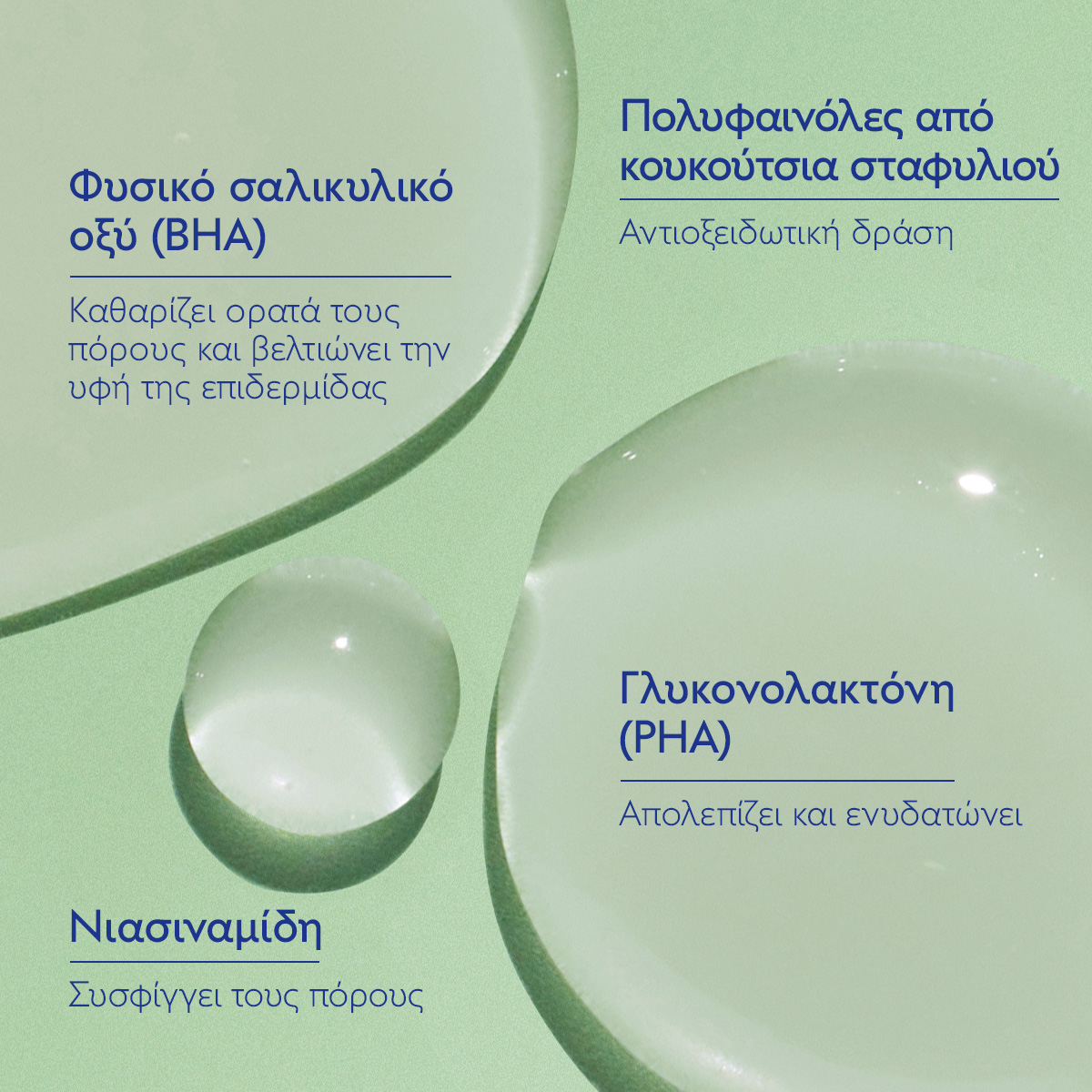 Γνωστότερη και ως Βιταμίνη B3, μειώνει τους διεσταλμένους πόρους και καταπραΰνει την επιδερμίδα. - Πολυφαινόλες σταφυλιού