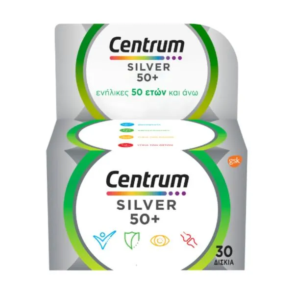 Το Centrum Silver 50+ είναι ένα συμπλήρωμα διατροφής με προσαρμοσμένα επίπεδα βιταμινών, μετάλλων και ιχνοστοιχείων, ώστε να ανταποκρίνεται στις διατροφικές ανάγκες των ενηλίκων 50 ετών και άνω.