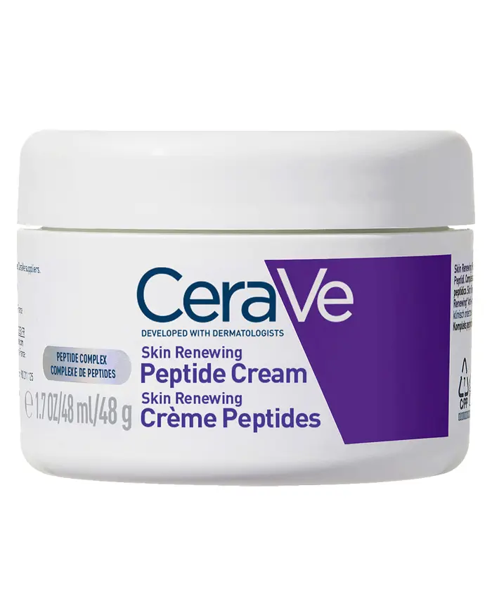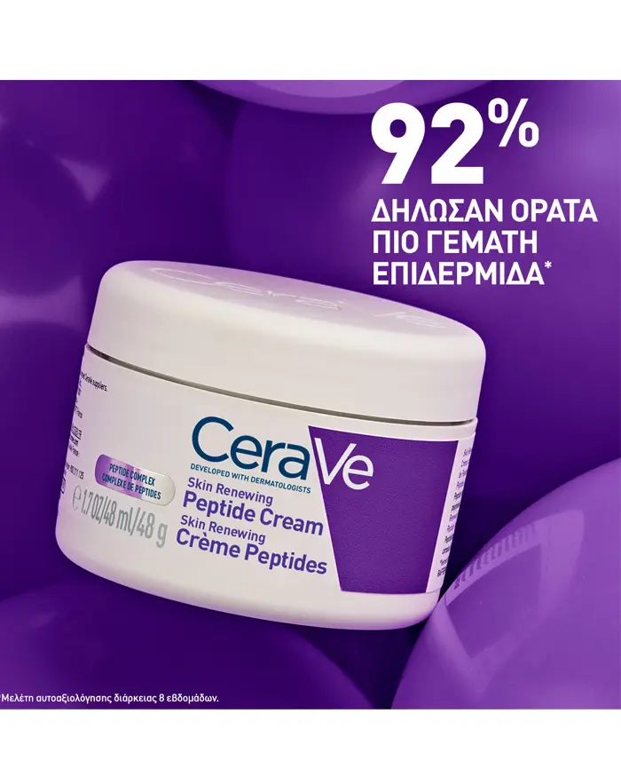 Η CeraVe Skin Renewing Peptide Cream περιέχει ένα σύμπλοκο Πεπτιδίων, Υαλουρονικού Οξέος και 3 απαραίτητων Ceramides που δρουν συνεργιστικά «κλειδώνοντας» την πολύτιμη υγρασία στο δέρμα και διαφυλάσσοντας τον προστατευτικό φραγμό του.
