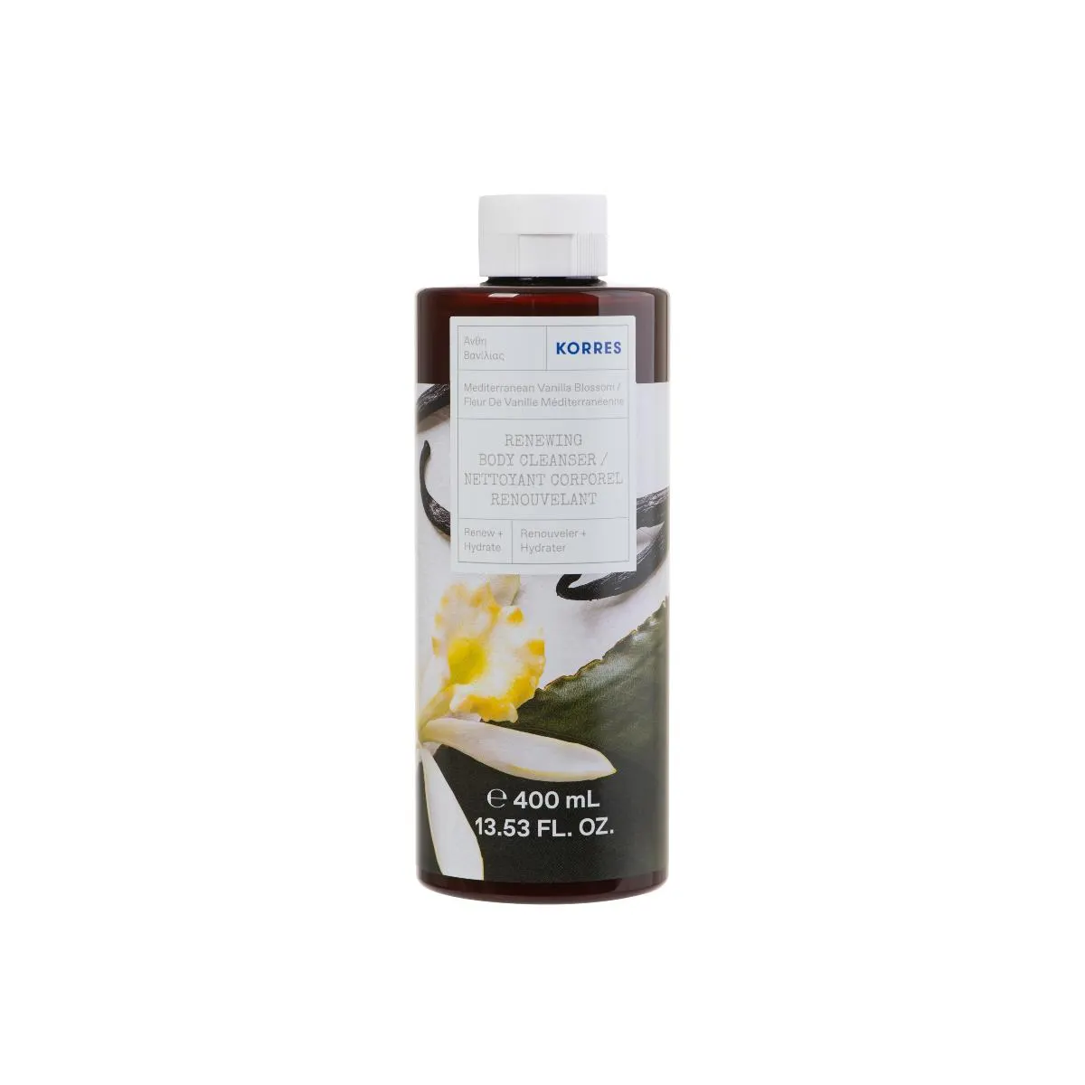 To Korres Renewing Body Cleanser Mediterranean Vanilla Blossom είναι ένα αφρόλουτρο με ιδιαίτερο άρωμα βανίλιας με απαλές νότες από λευκά άνθη. Είναι εμπλουτισμένο με πρωτεΐνες Σιταριού και εκχυλίσματα Αλόης και Αλθαίας το οποίο βοηθά στη διατήρηση των επιπέδων ενυδάτωσης της επιδερμίδας.
