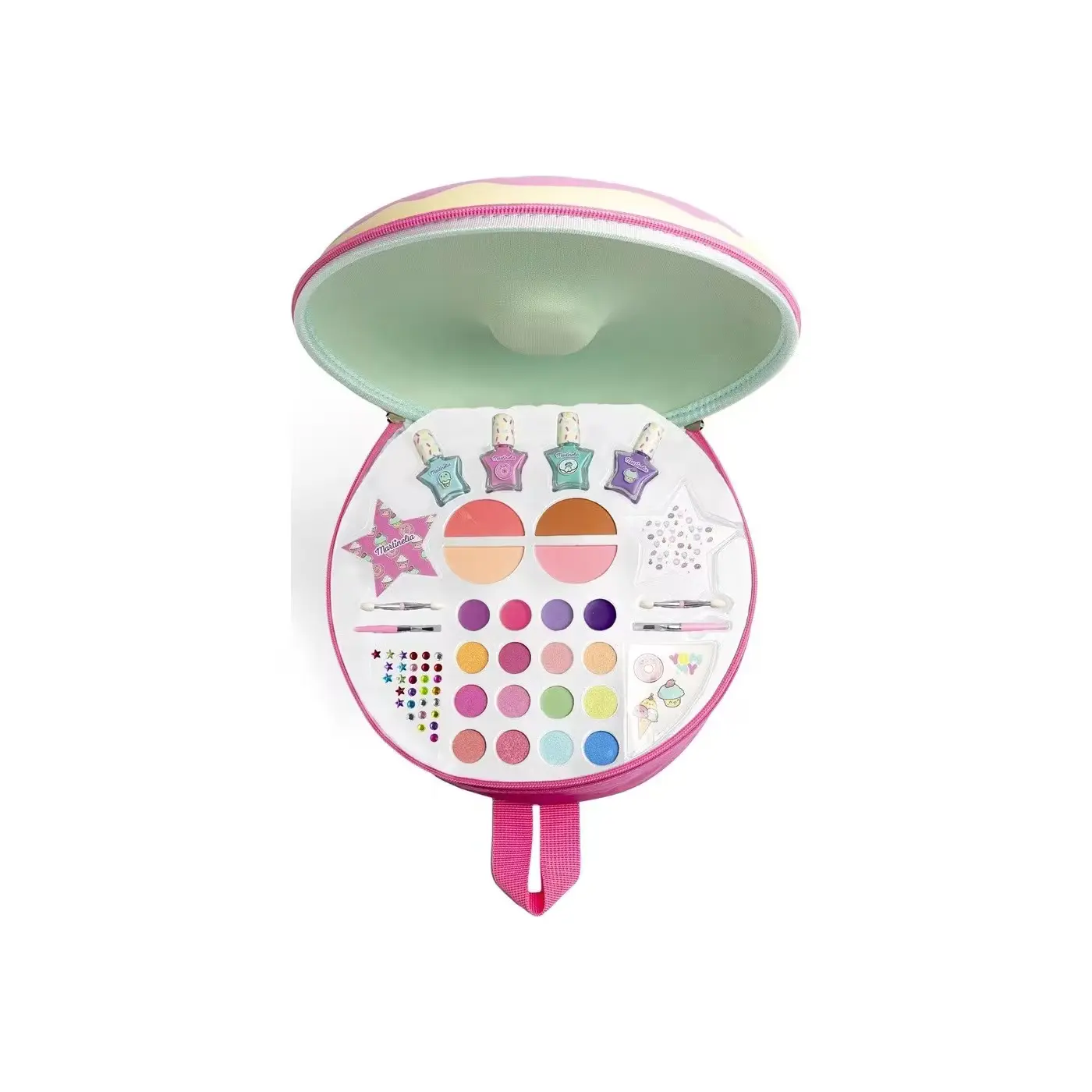 Παιδικό backpack σε σχέδιο και σχήμα donut, το οποίο περιλαμβάνει ένα παιδικό σετ ομορφιάς με 12 σκιές ματιών, 4 lip glosses, 4 ρουζ, 4 υδατοδιαλυτά βερνίκια νυχιών, stickers, στρασάκια και 1 λίμα.