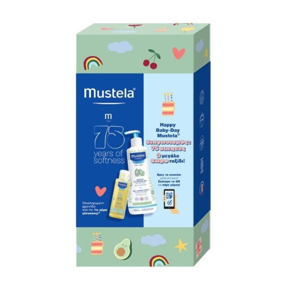 Mustela Happy Baby-Day 75 Years Promo Απαλό Αφροντούς 500ml & Λάδι Μασάζ 100ml, 1σετ