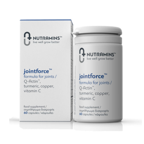 Το jointforce™ της Nutramins™ με Q-Actin®, κουρκούμη (κουρκουμά), χαλκό και Βιταμίνη C είναι ένα επιστημονικά σχεδιασμένο, κλινικά αποδεδειγμένο μίγμα φυτικών εκχυλισμάτων, βιταμινών και ιχνοστοιχείων που σχεδιάστηκε και παράγεται αποκλειστικά από τη Nutramins™, ώστε να συμβάλλει στη φυσιολογική λειτουργία των αρθρώσεων και τη διατήρηση του φυσιολογικού σχηματισμού κολλαγόνου και συνδετικού ιστού.