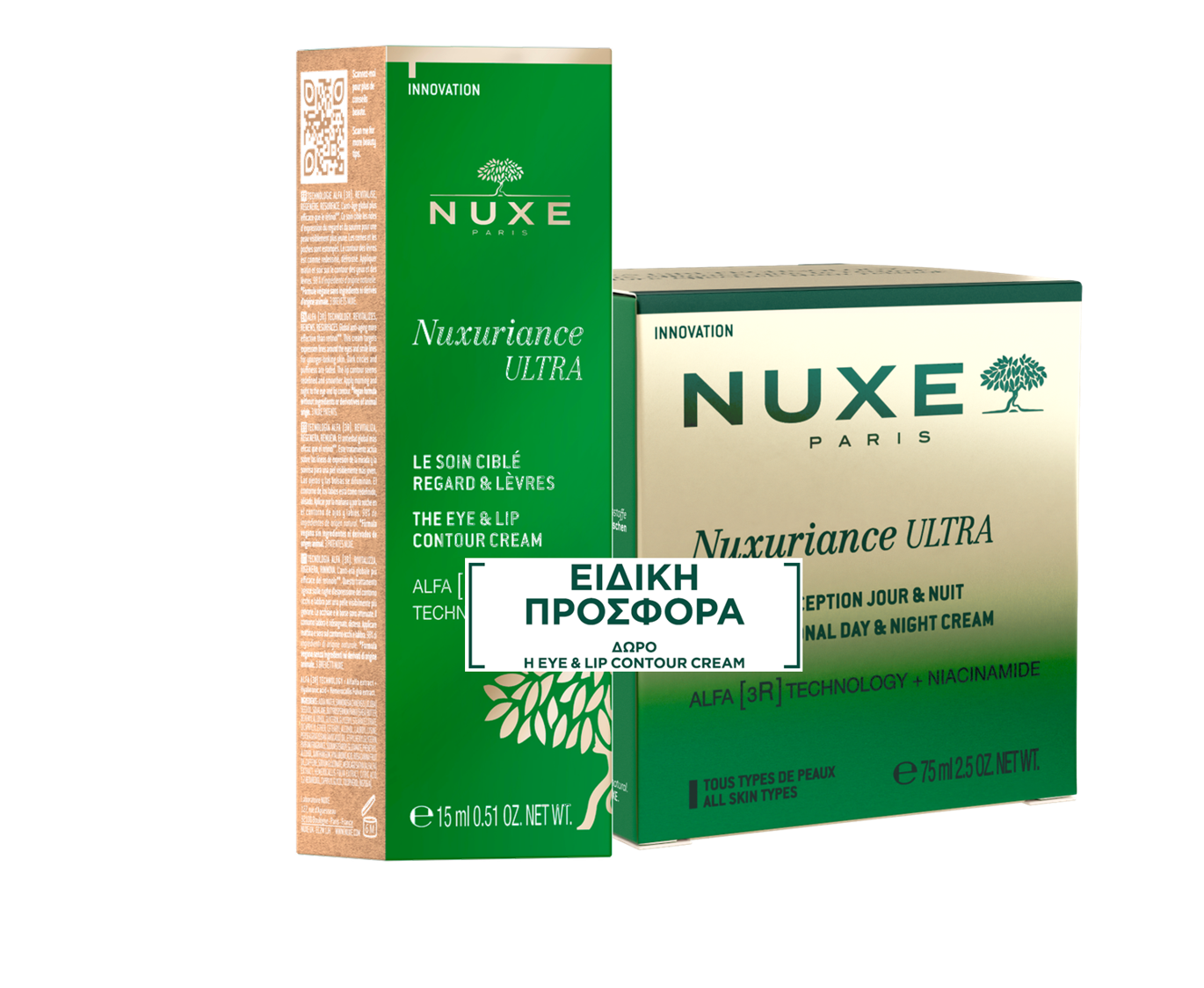 Σετ προσφοράς ολοκληρωμένης αντιγηραντικής φροντίδας προσώπου, ματιών & χειλιών από τη Nuxe Nuxuriance Ultra. Περιλαμβάνει την Exceptional Day & Night Cream για ορατή ανανέωση, σύσφιξη και σε μισή τιμή, την The Eye & Lip Cream που στοχεύει στις ρυτίδες έκφρασης, τους μαύρους κύκλους και το πρήξιμο.