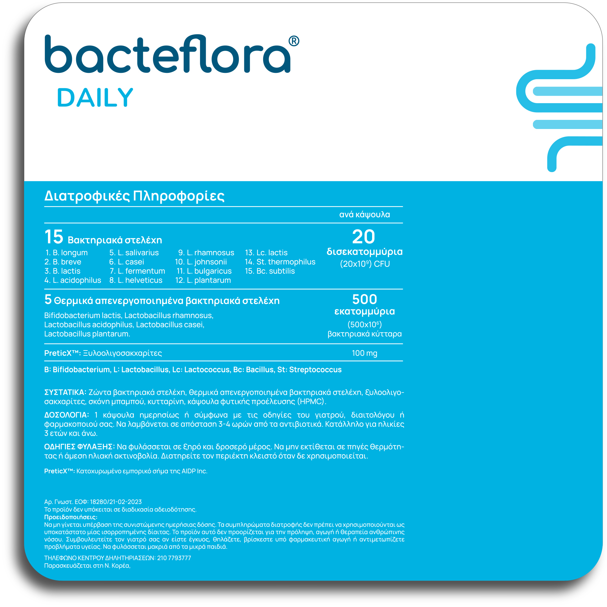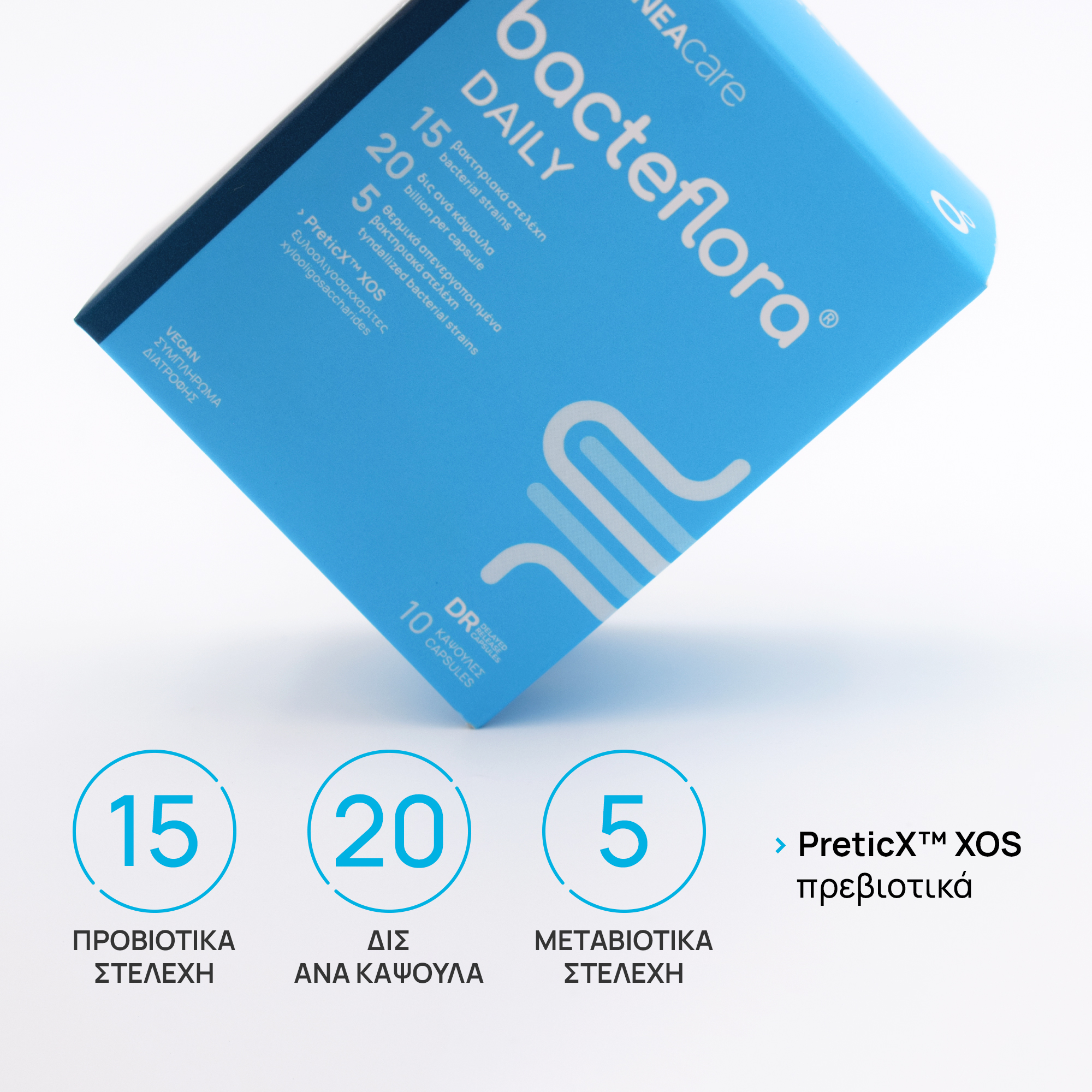 Συμπλήρωμα διατροφής με 15 στελέχη προβιοτικών, 20 δις ανά κάψουλα, πρεβιοτικά ξυλοολιγοσακχαρίτες PreticX™ και 5 μεταβιοτικά στελέχη.