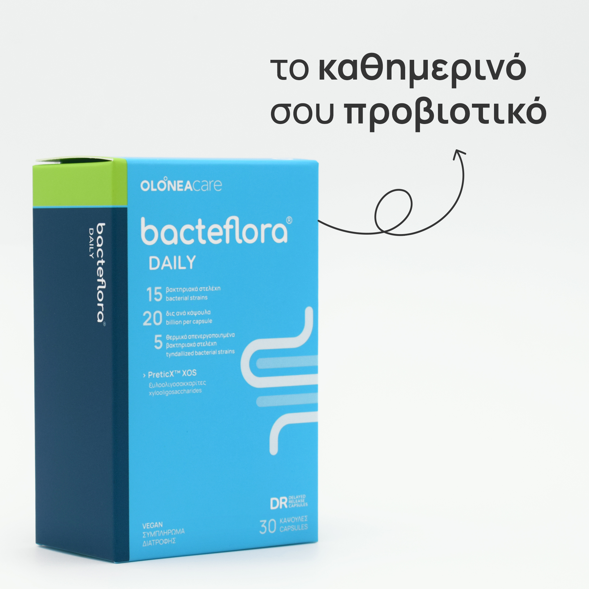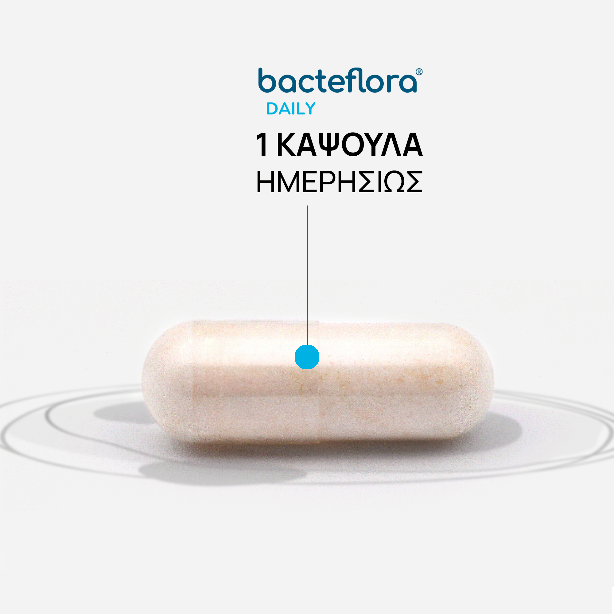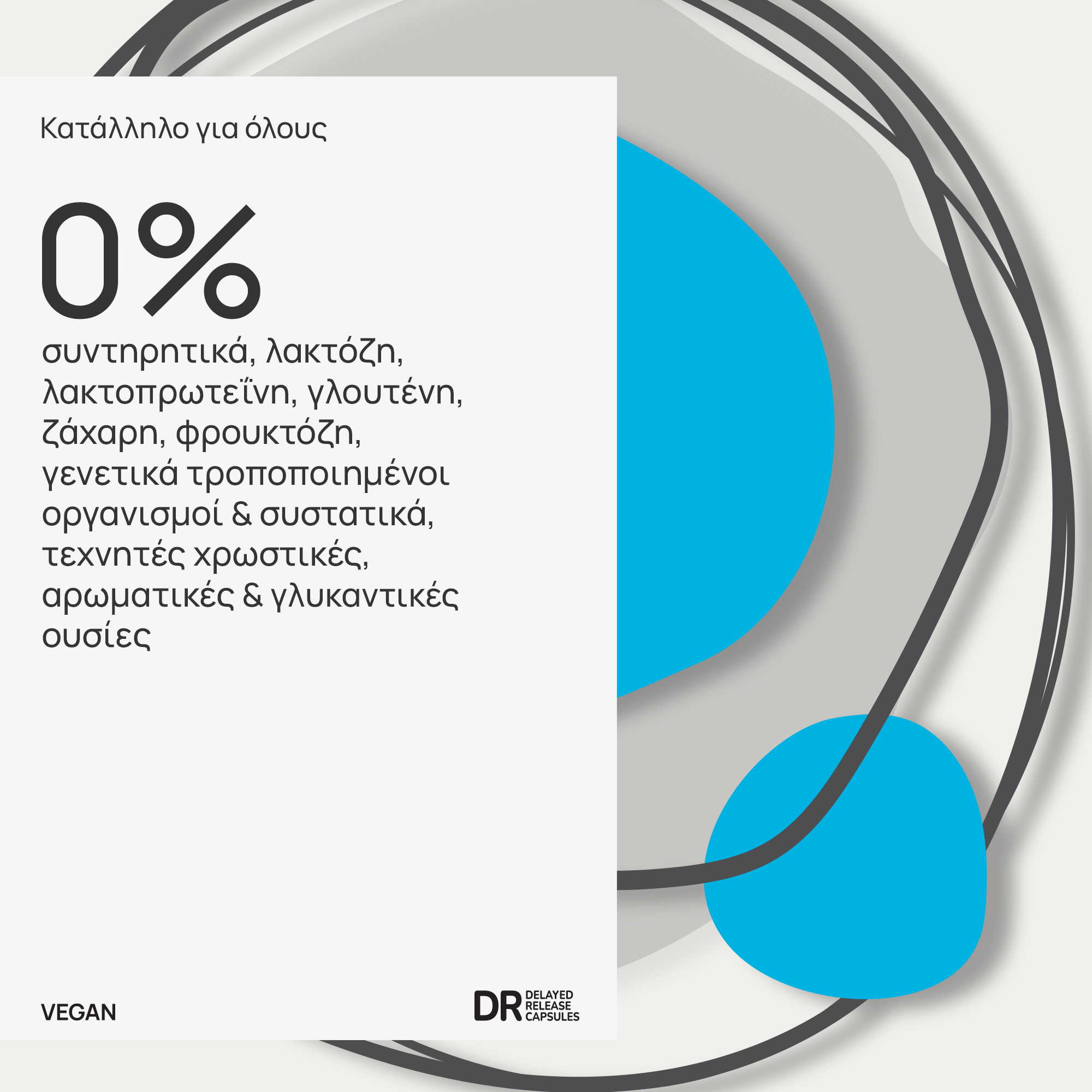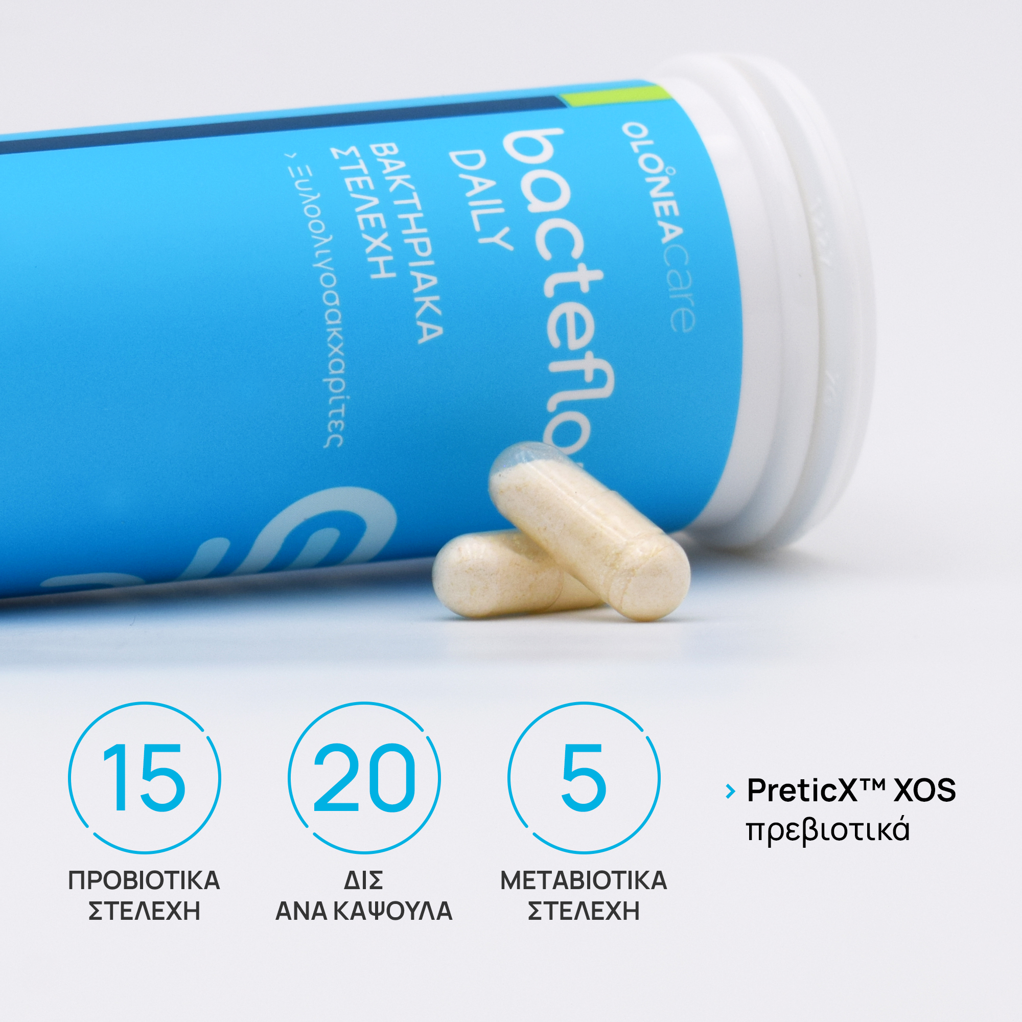 Συμπλήρωμα διατροφής με 15 στελέχη προβιοτικών, 20 δις ανά κάψουλα, πρεβιοτικά ξυλοολιγοσακχαρίτες PreticX™ και 5 μεταβιοτικά στελέχη.