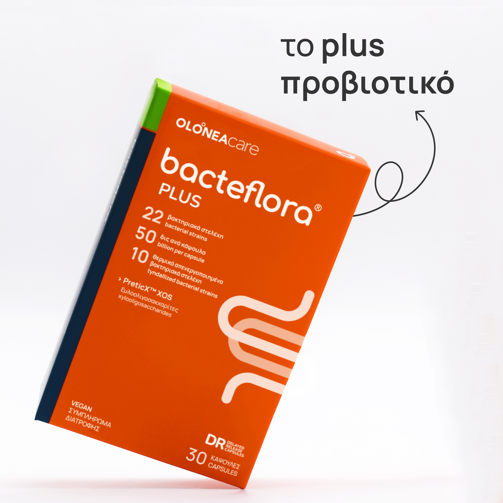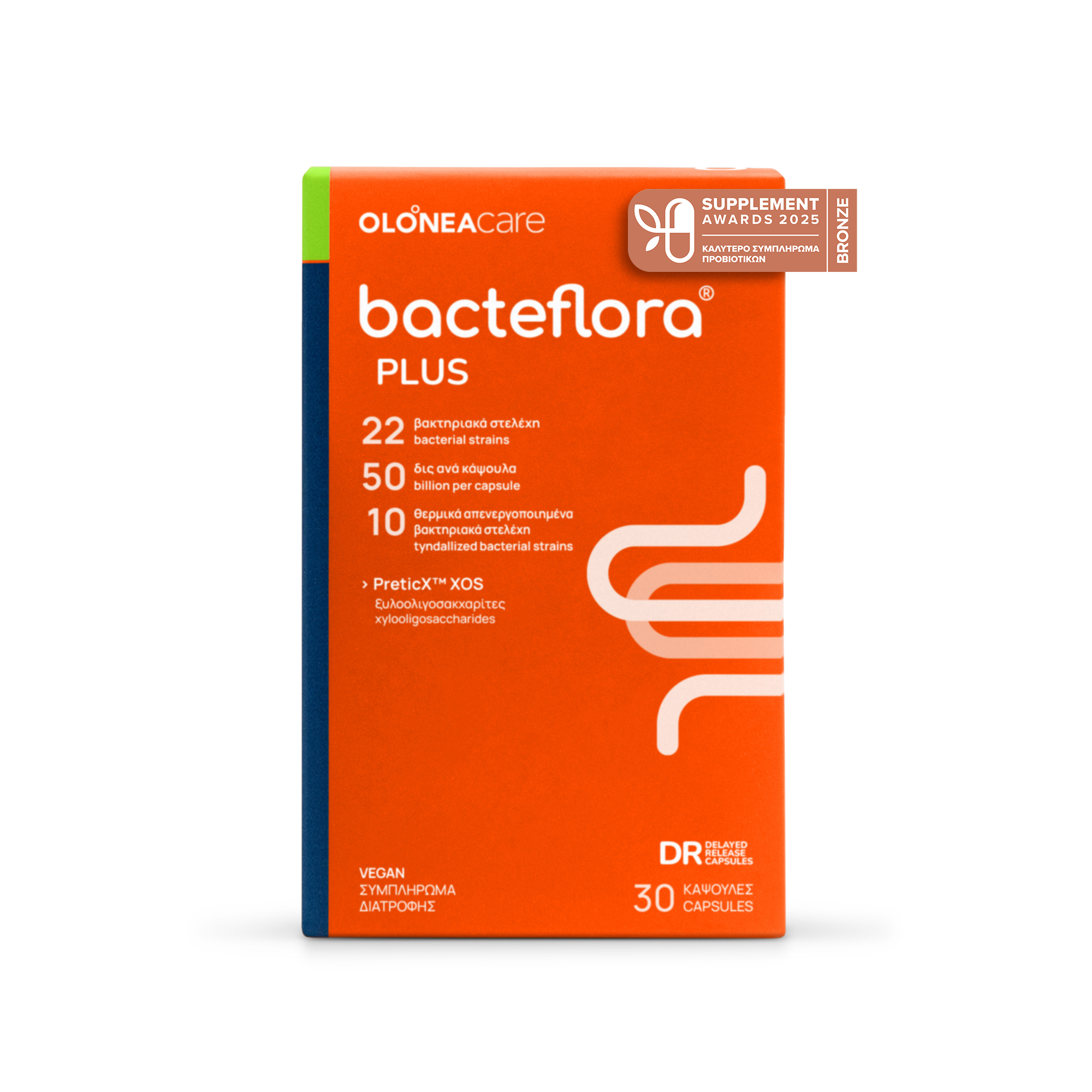 Συμπλήρωμα διατροφής με 22 στελέχη προβιοτικών, 50 δις ανά κάψουλα, πρεβιοτικά ξυλοολιγοσακχαρίτες PreticX™ και 10 μεταβιοτικά στελέχη.