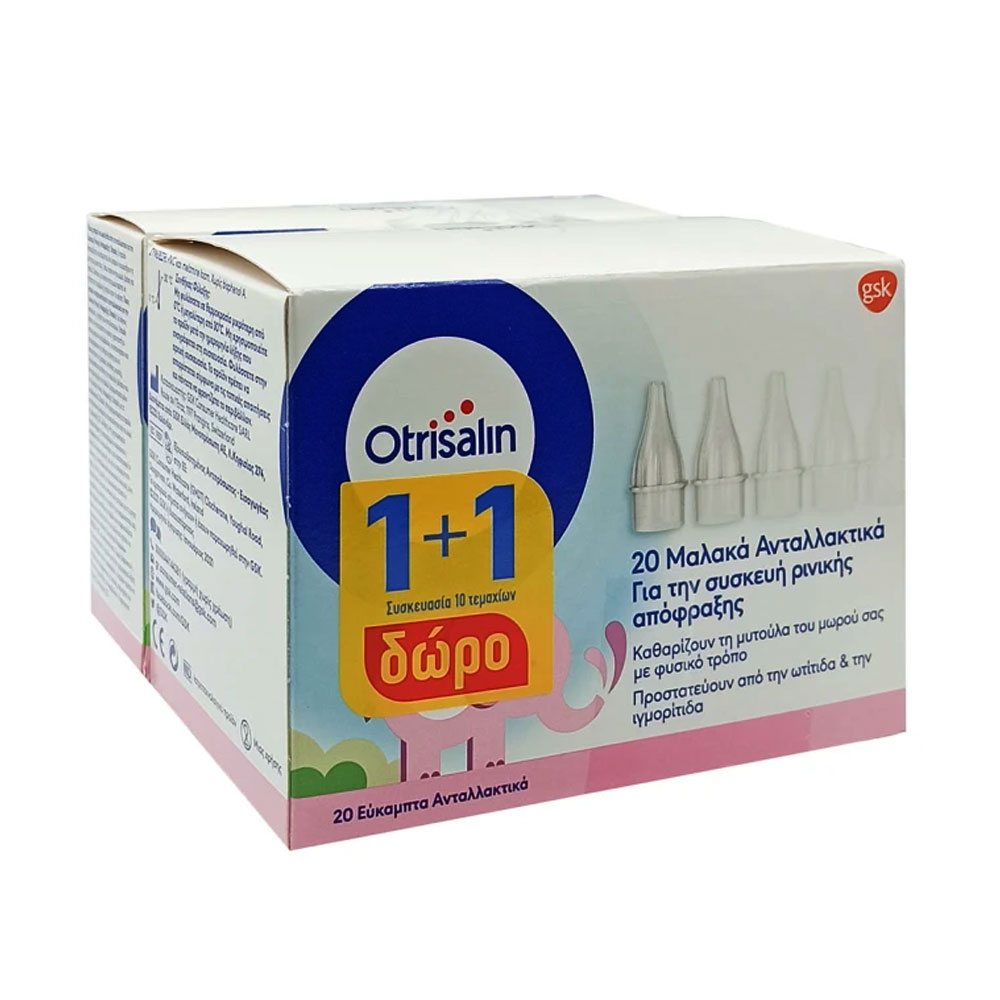 Η συσκευασία ανταλλακτικών Otrisalin περιέχει 20 εύκαμπτα ανταλλακτικά ακροφύσια μιας χρήσης με απορροφητικό φίλτρο που χρησιμοποιούνται με την Συσκευή Ρινικής Απόφραξης Otrisalin για μωρά ( Η συσκευή Ρινικής Απόφραξης πωλείται ξεχωριστά ) .