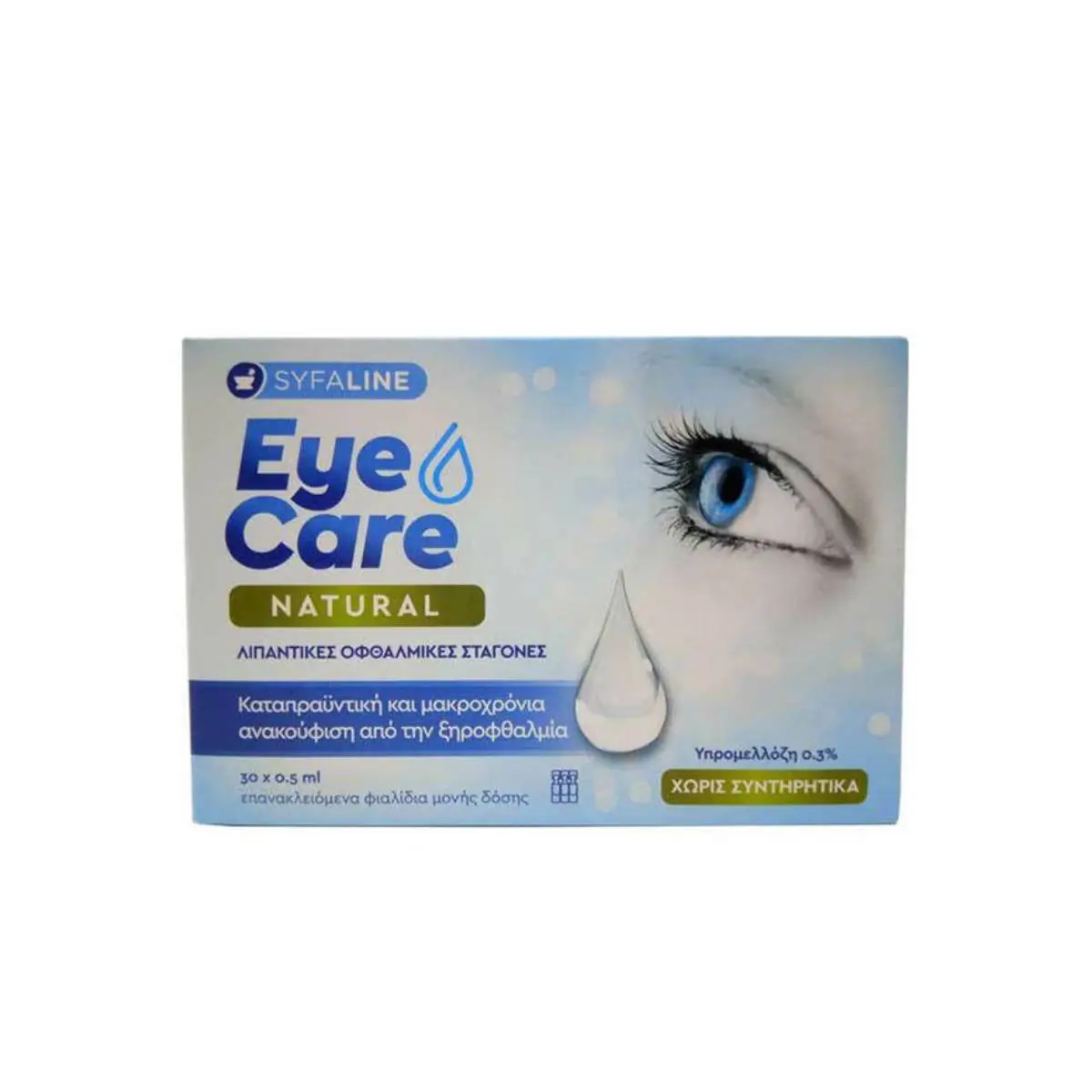 Το Syfaline Eye Care Natural είναι ένα οφθαλμικό διάλυμα που περιέχει υπρομελλόζη, ένα πολυμερές με ενυδατικές και ιξωδοελαστικές ιδιότητες που προστατεύουν και λιπαίνουν την οφθαλμική επιφάνεια.