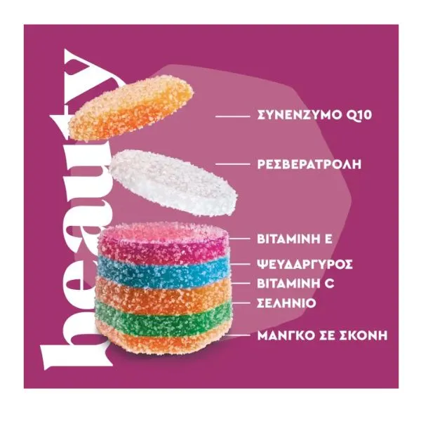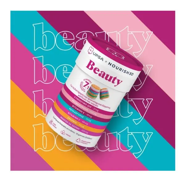 Τα UPSAxNOURISHED Beauty Gummies με ψευδάργυρο, σελήνιο και βιταμίνες, συμβάλλουν στην διατήρηση του φυσιολογικού δέρματος, μαλλιών και νυχιών, υποστηρίζοντας την παραγωγή κολλαγόνου και την προστασία από το οξειδωτικό στρες.