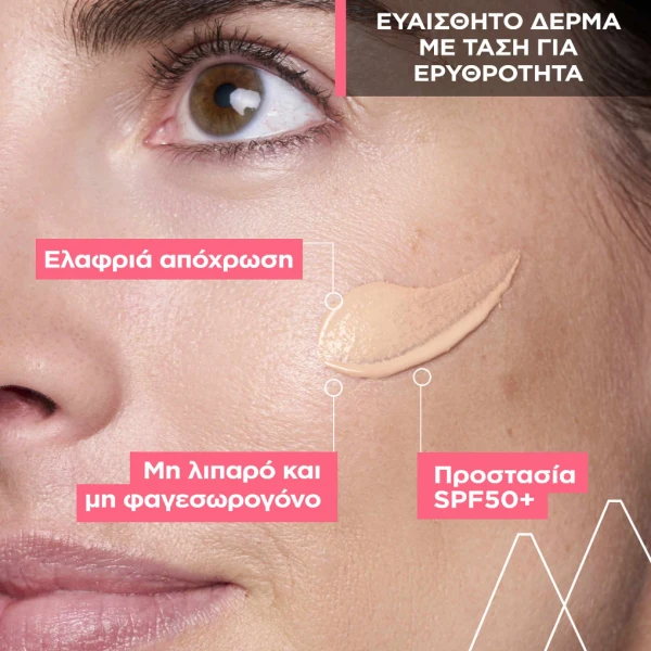 Προσφέρει άμεση κάλυψη και ομοιόμορφο τόνο, καταπραΰνει το δέρμα και προστατεύει από την ηλιακή ακτινοβολία χάρη στον υψηλό δείκτη SPF50+.