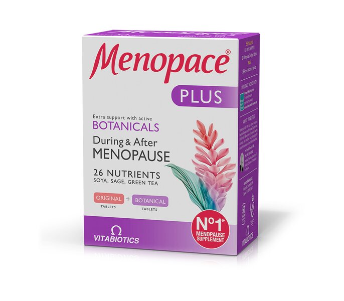 Το Menopace Plus της Vitabiotics είναι μια διπλή συσκευασία που περιλαμβάνει τις ταμπλέτες Menopace μαζί με δραστικές ταμπλέτες βοτάνων με φυτοοιστρογόνα για γυναίκες που υποφέρουν σε μεγάλο βαθμό από τα συμπτώματα της εμμηνόπαυσης και επιζητούν μια πιο δραστική ενίσχυση του οργανισμού τους. Οι ταμπλέτες Menopace περιέχουν βιταμίνες και μέταλλα, συστατικά που συμβάλλουν στη διατήρηση της υγείας και της ζωντάνιας των γυναικών πριν, κατά τη διάρκεια και μετά την εμμηνόπαυση, βοηθώντας στην υγεία και την καλή λειτουργία της καρδιάς, του ανοσοποιητικού, των οστών, των νεύρων, του δέρματος και του κόλπου.